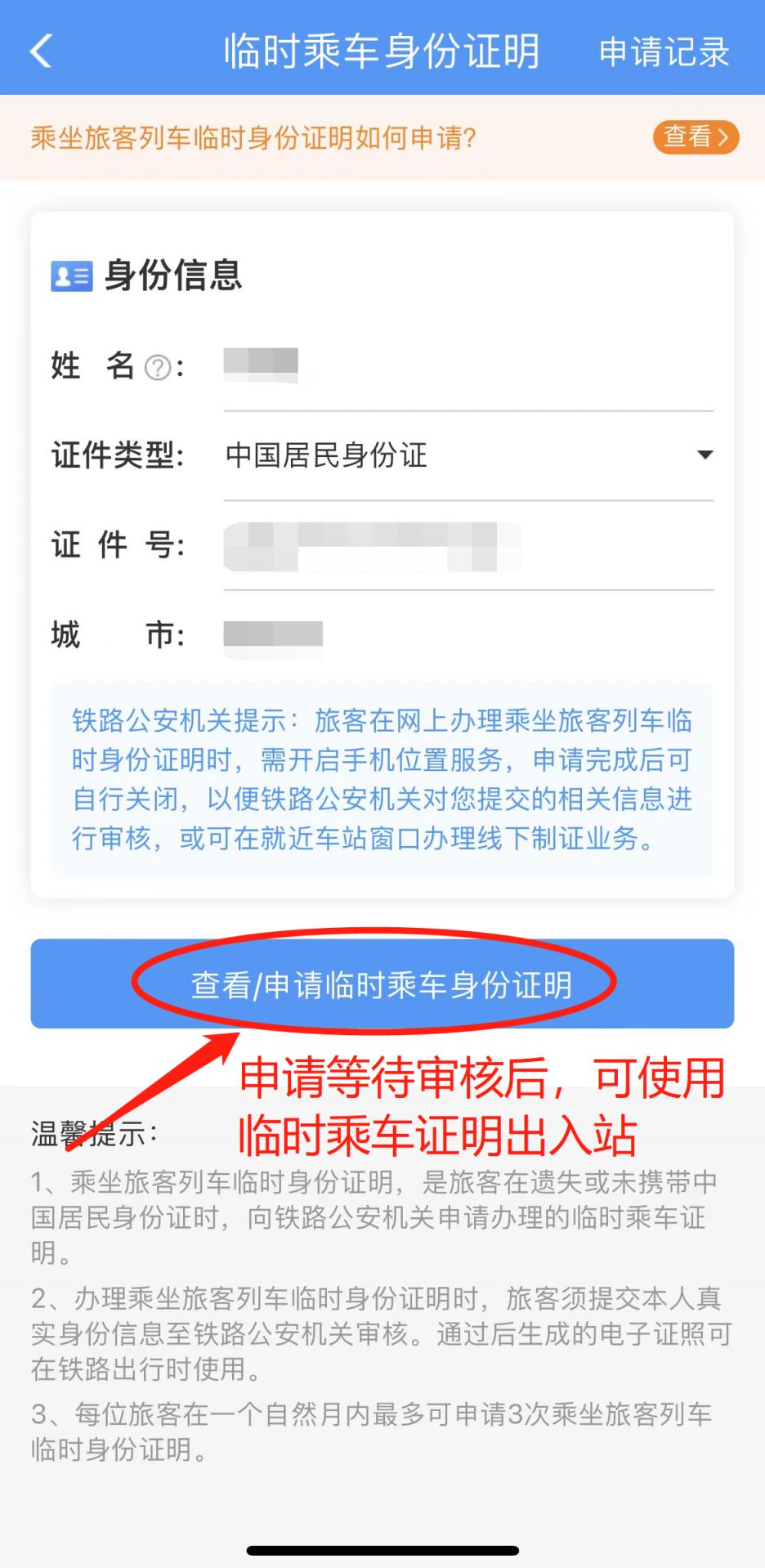 ### 4. 高铁站求助 - 如果没有临时身份证,可以前往车站服务台求助,说明情况。 - "车站协助":车站工作人员会根据情况提供帮助,如提供临时乘车证明等。