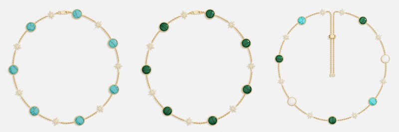 左: 湖蓝色Météorites项圈NT8,600,中: 孔雀石 Météorites 项圈NT8,600,右: Météorites 可调节项鍊NT10,400
