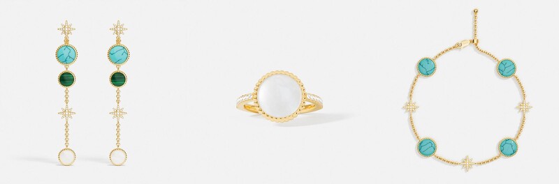 左: Météorites吊坠耳钉NT6,400,中: 白母贝Météorites戒指NT2,800,右: 湖蓝色Météorites手鍊NT4,800 全台APM Monaco专柜均有贩售